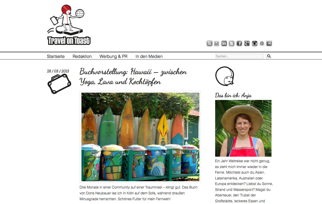 Über mich Buchvorstellung: Hawaii – zwischen Yoga, Lava und Kochtöpfen erschienen auf: Travel on Toast, 28.3.2013 lesen >>