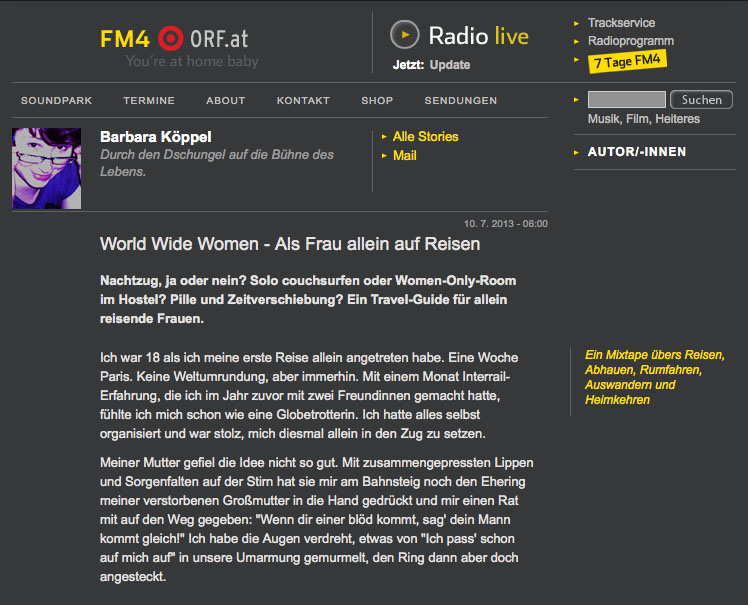 Interviews World Wide Women – Als Frau allein auf Reisen Interview und Live-Auftritt auf FM4, Juli 2014 lesen >> reinhören >>