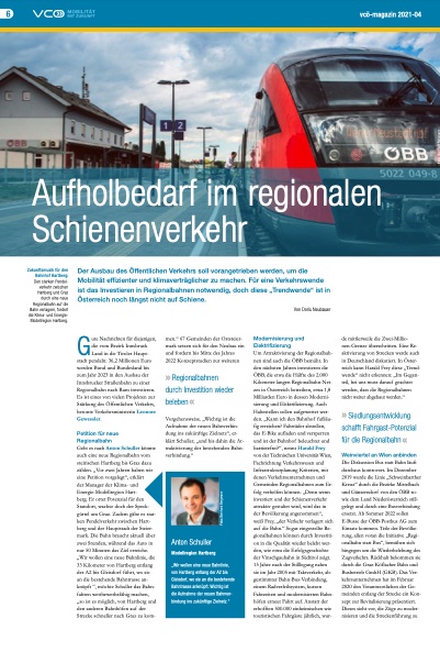Meine Arbeit schwarz auf weiß Aufholbedarf im regionalen Schienenverkehrerschienen in VCÖ Magazin 4/2021Artikel lesen (S. 6 f)>>