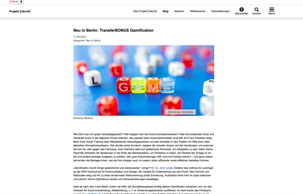 Meine Arbeit schwarz auf weiß Neu in Berlin: TransferBONUS Gamificationerschienen auf Projekt Zukunft, Sept 2023Artikel lesen>>