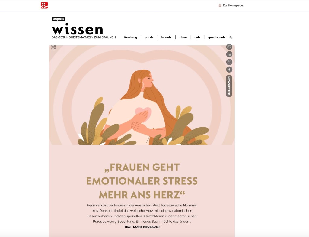 Meine Arbeit schwarz auf weiß „Frauen geht emotionaler Stress mehr ans Herz“erschienen in Impuls Wissen, 13.10.2023Artikel lesen >>