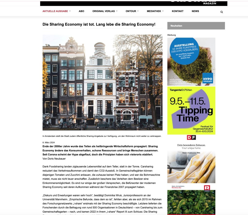 Meine Arbeit schwarz auf weiß Die Sharing Economy ist tot. Lang lebe die Sharing Economy. erschienen in Original Magazin 1/2024Artikel lesen >>
